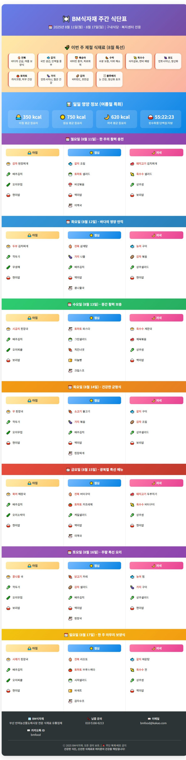 BM식자재 주간식단표 2025.08.11-08.17 페이지 정보 작성자 (BM)운영자 댓글 0건 조회 1,078회 작성일 25-08-11 08:23 본문 BM식자재 주간식단표 2025.08.11-08.17 목록 이전글BM식자재 주간식단표 (2025년 8월 4주차) 25.08.19 다음글2025년 8월 1주 차 (8.4-8.10) 25.08.04 댓글목록 댓글목록 등록된 댓글이 없습니다.
