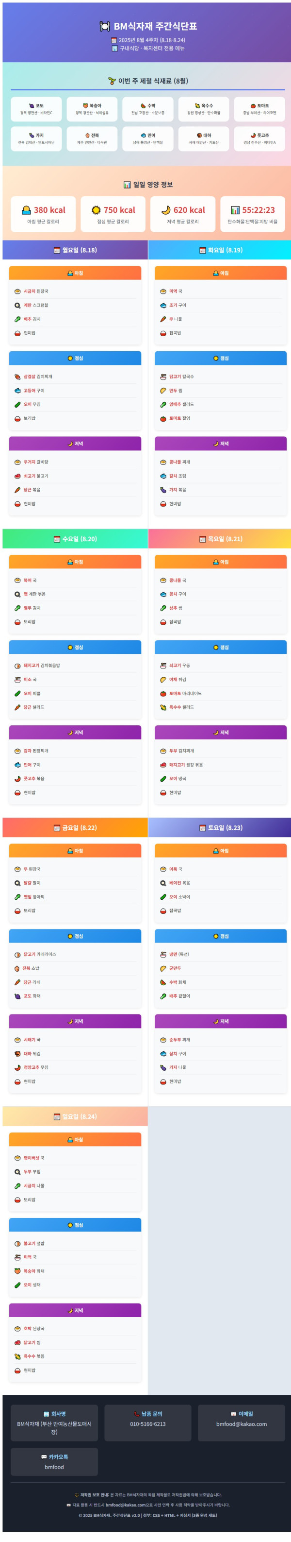 BM식자재 주간식단표 (2025년 8월 4주차) 페이지 정보 작성자 (BM)운영자 댓글 0건 조회 1,011회 작성일 25-08-19 06:01 본문 BM식자재 주간식단표 (2025년 8월 4주차) 목록 이전글BM주간식단표 2025년 8월 4주차 (8.25-8.31) 25.08.25 다음글BM식자재 주간식단표 2025.08.11-08.17 25.08.11 댓글목록 댓글목록 등록된 댓글이 없습니다.