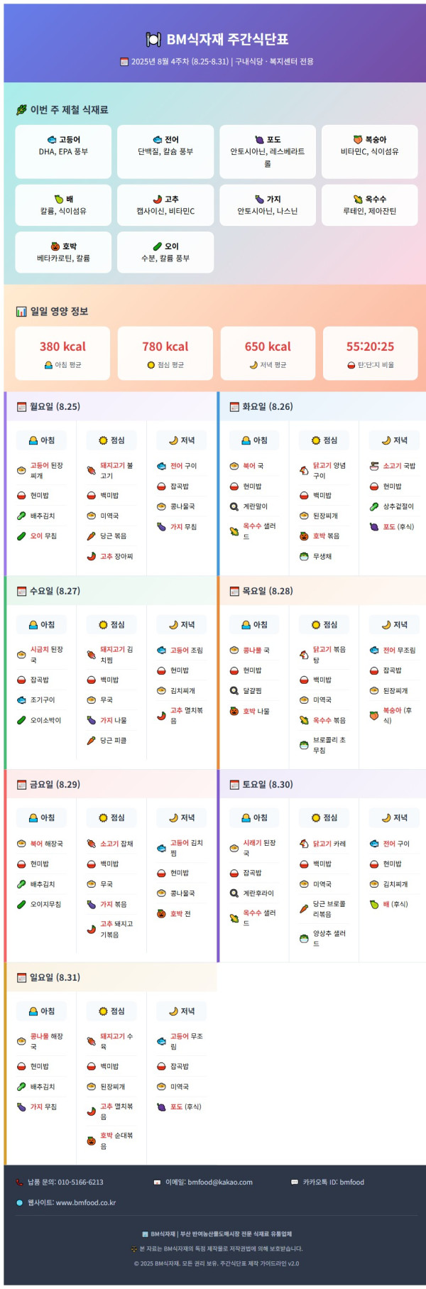 BM주간식단표 2025년 8월 4주차 (8.25-8.31) 페이지 정보 작성자 (BM)운영자 댓글 0건 조회 1,079회 작성일 25-08-25 00:04 본문 BM주간식단표 2025년 8월 4주차 (8.25-8.31) 목록 이전글BM주간식단표 2025년 9월 1주 차 (9.02-9.08) 25.08.30 다음글BM식자재 주간식단표 (2025년 8월 4주차) 25.08.19 댓글목록 댓글목록 등록된 댓글이 없습니다.