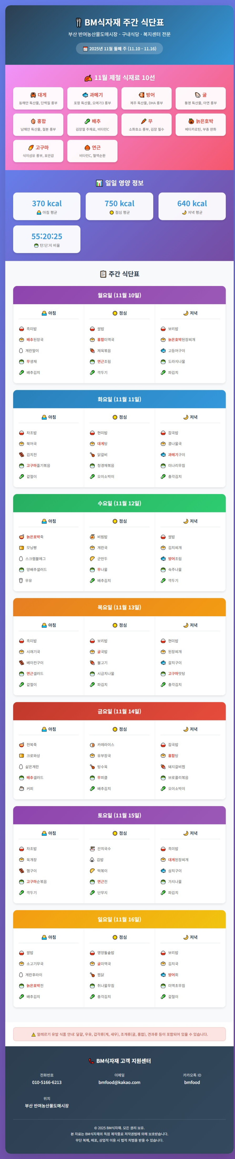 BM주간식단표(2025년 11월 10일~16일) 페이지 정보 (BM)운영자 작성일25-11-07 05:52 조회109회 댓글0건 이전글 다음글 목록 본문 BM주간식단표(2025년 11월 10일~16일) #비엠식자재 #비엠식재료 #부산식자재 #부산식재료 #반여농산물 #단체급식 #주간식단 #주간식단표#식당식자재 #유치원급식 #복지관급식 #식자재배송 #병원식자재 #병원식재료 #부산식재료도매 #신선야채 댓글목록 등록된 댓글이 없습니다. 이전글 다음글 목록